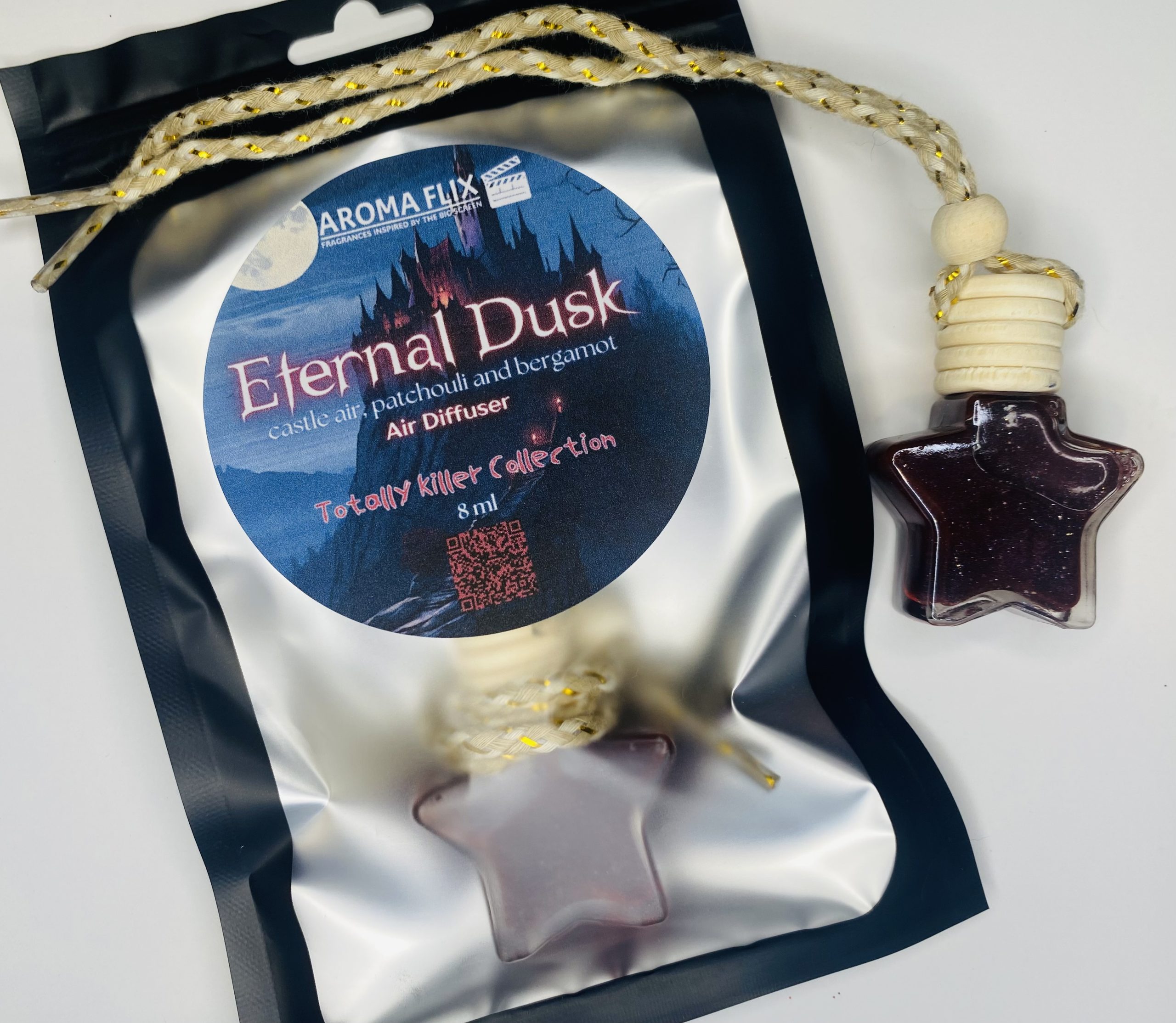 Immerse yourself in a mysterious world of shadow and intrigue with “Eternal Dusk,” the haunting fragrance inspired by Dracula. The initial crispness of chilly, castle air will transport you to a moonlit landscape, while the deep heart of bergamot and patchouli evokes the foreboding presence of the enigmatic Count as he prowls through candlelit corridors and drafty foyers. A strong base of eucalyptus and balsam pays homage to Transylvania, characterized by its dark forests, imposing mountains, and the ominous castle where the Count resides. As this masculine-leaning fragrance melts, the scent will transport you to a world where night reigns and passion never dies.
