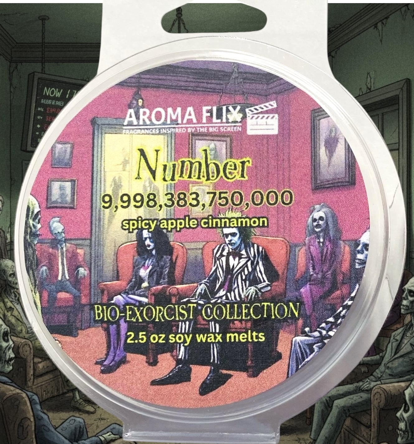 In Beetlejuice, the afterlife—known as the Netherworld—is a chaotic, bureaucratic realm filled with quirky rules and eccentric characters. Newly deceased souls must navigate a confusing system involving caseworkers, waiting rooms, and haunting manuals. It’s not a peaceful eternity—it’s more like a surreal DMV for the dead.  Inspired by Beetlejuice’s incessantly long number in the afterlife waiting room, Number 9,998,383,750 will melt in the aroma of spicy cinnamon apples and is adorned with glow in the dark stars.